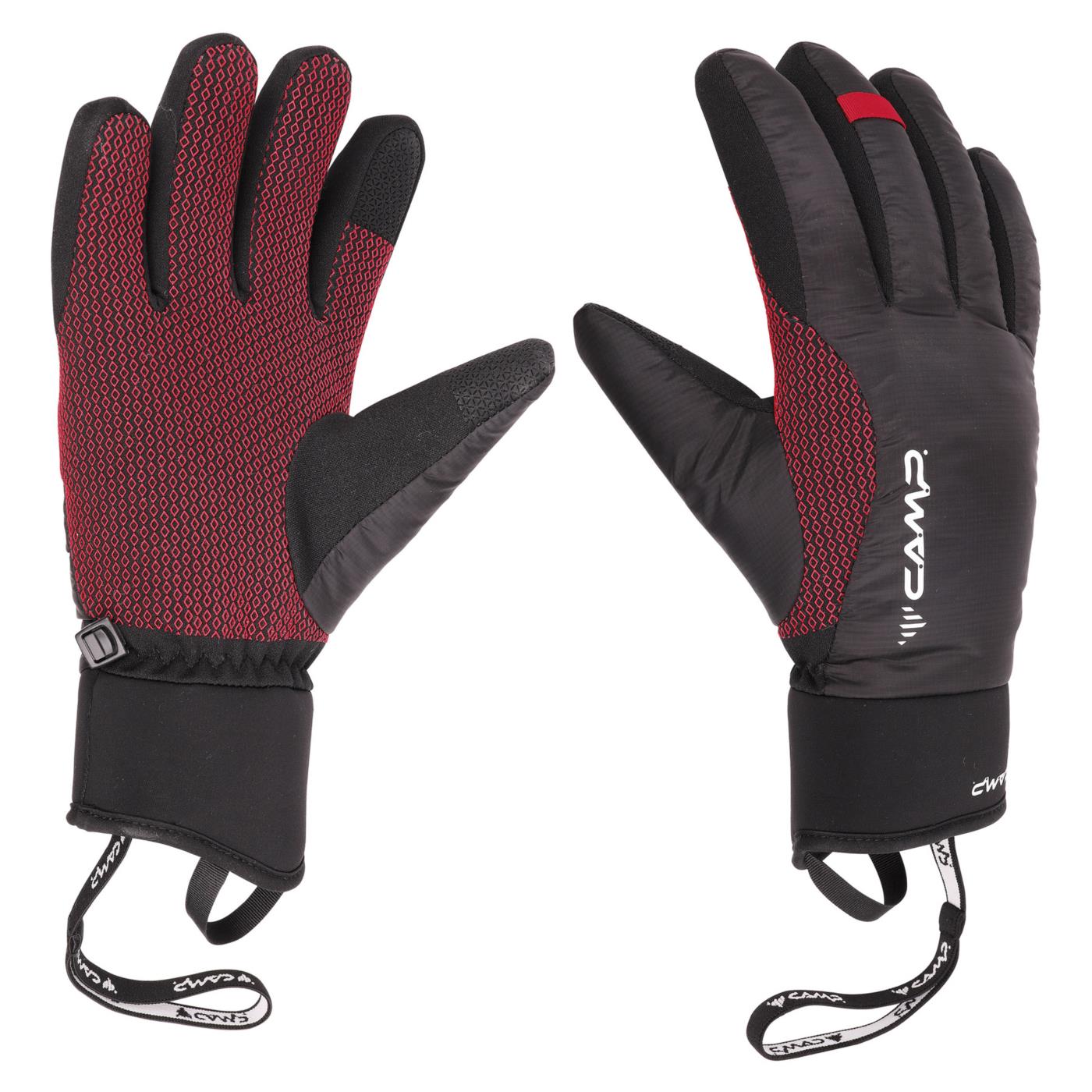 Le stampe in silicone sul palmo e sulle dita garantiscono una presa saldissima su bastoncini e piccozze, rendendo il prodotto polivalente e ideale per diverse attività.