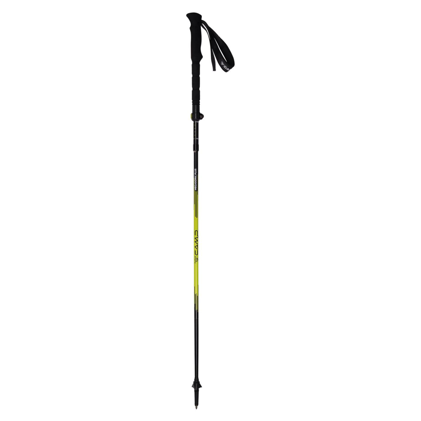 Il Megasonic Plus è un bastoncino polivalente che, grazie ai segmenti di sezione maggiorata, combina la praticità e la compattezza dei modelli pieghevoli con la resistenza di quelli telescopici. Realizzato interamente in alluminio, presenta una doppia impugnatura con prolunga ergonomica in materiale espanso che assicura un’eccellente presa a diverse altezze. I laccioli ergonomici incrementano il comfort in ogni condizione di utilizzo. Il cavetto in acciaio interno, rivestito in poliammide, è flessibile e resistente e permette di montare e smontare il bastoncino con facilità in tutte le situazioni. Il montaggio è agevolato e reso più veloce dalla speciale forma conica dei raccordi dei segmenti. Il segmento superiore è dotato di un efficace sistema di bloccaggio con clip di alluminio che consente una rapida e sicura regolazione della lunghezza.