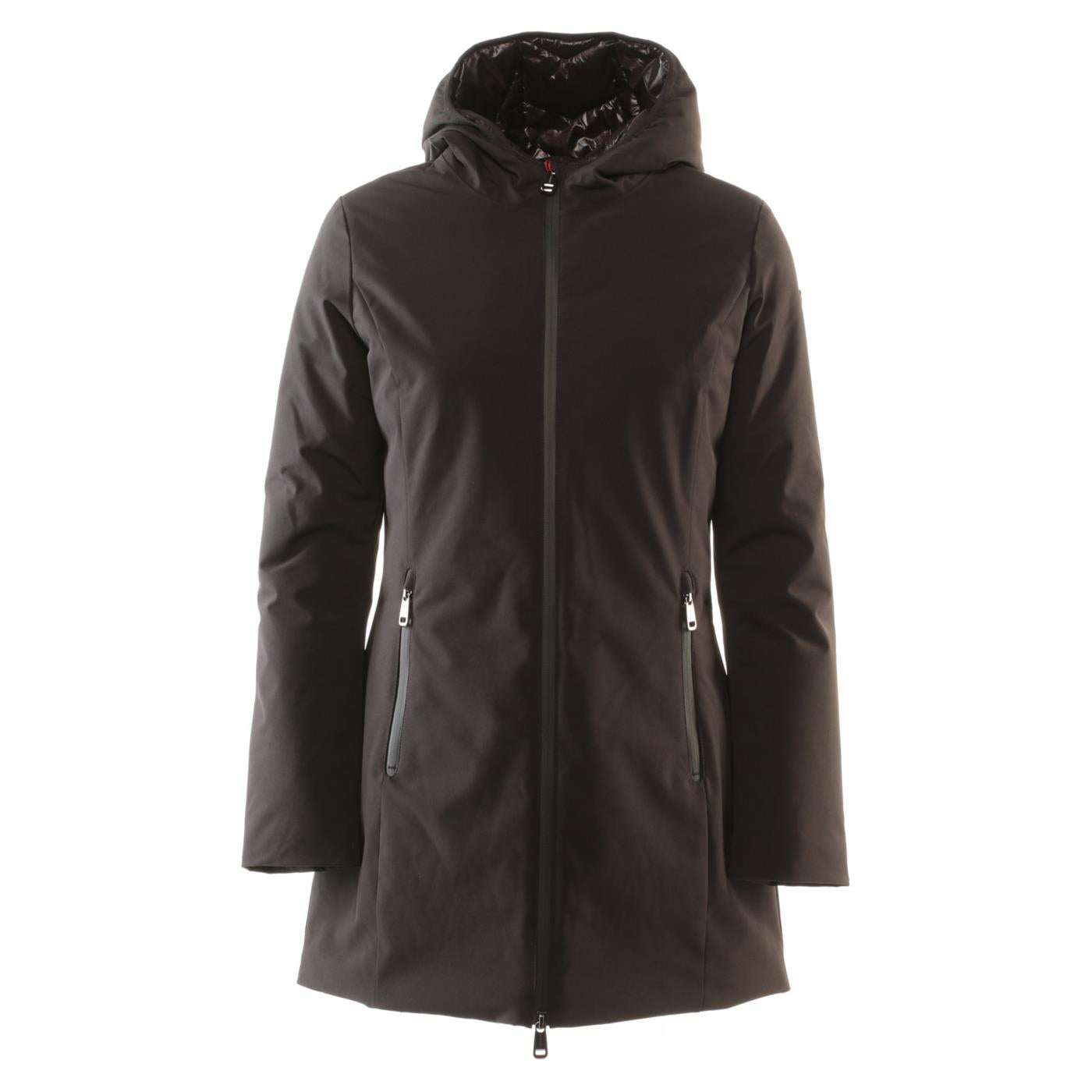 Long jacket della linea Zeropuntotech imbottito in Plume No Plume e realizzato in tessuto tecnico ad alte prestazioni HidraNek Two Way Stretch. Si compone di un'apertura centrale con zip waterproof e due tasche con chiusura a zip waterproof, un cappuccio fisso, e cuciture critiche termosaldate.