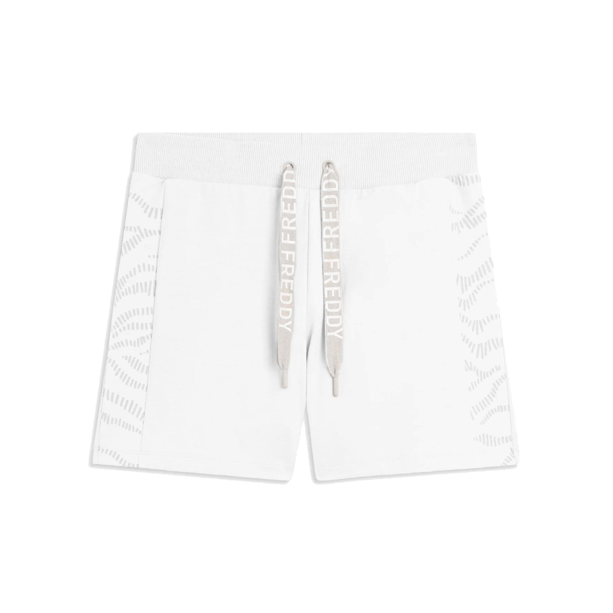 Pantaloni corti con vestibilità regular e fondo dritto, vita in costina con coulisse logata FREDDY. Gli inserti laterali con motivo grafico ondulato aggiungono carattere al capo. Il logo FREDDY glitter è posizionato sul fianco posteriore sinistro. In French Terry elasticizzato, per un look fresco e dinamico.