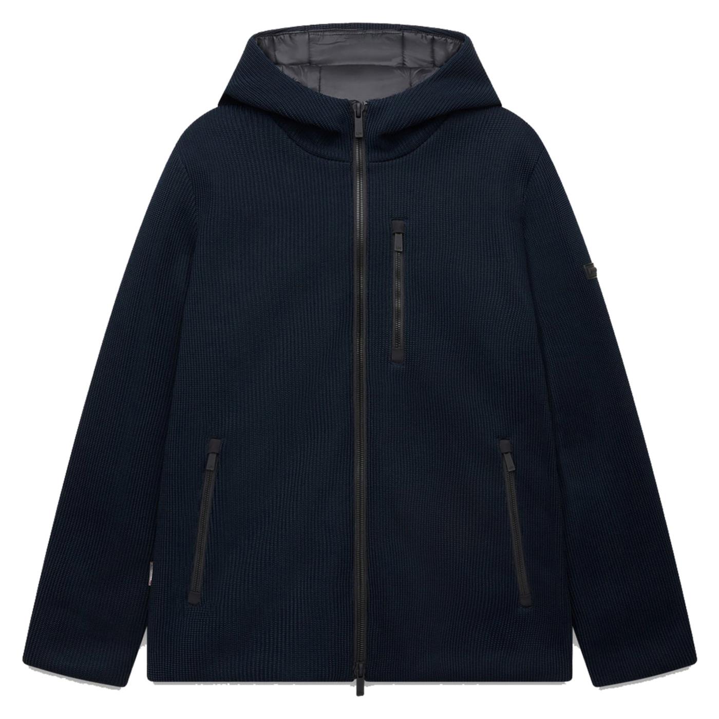 Jacket realizzata in un particolare tessuto a maglia ingegnerizzato. L’iconico tessuto è realizzato in una fibra in poliestere riciclato mechanical stretch di nuova generazione, e accoppiato in questo caso con un micropile termico in grado di garantire calore e transpirabilità. E’ sviluppato appositamente per coniugare il peso e il comfort di una maglia seppure garantendo le funzionalità protettive e la tecnicità di un capo outdoor.