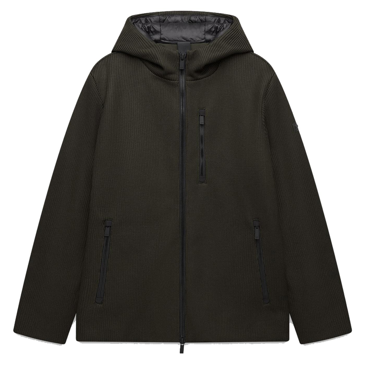 Jacket realizzata in un particolare tessuto a maglia ingegnerizzato. L’iconico tessuto è realizzato in una fibra in poliestere riciclato mechanical stretch di nuova generazione, e accoppiato in questo caso con un micropile termico in grado di garantire calore e transpirabilità. E’ sviluppato appositamente per coniugare il peso e il comfort di una maglia seppure garantendo le funzionalità protettive e la tecnicità di un capo outdoor.